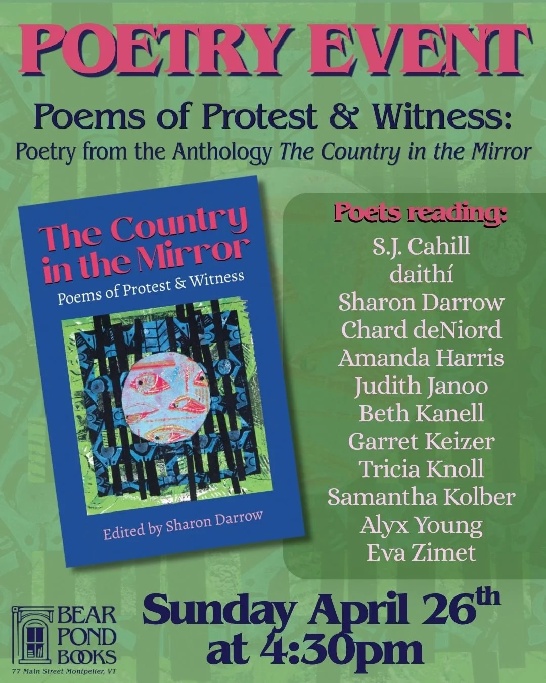 Anthology editor and poet Sharon Darrow brings together dissenting voices in The Country in the Mirror: Poems of Protest & Witness. The collection features nearly ninety poets, and a selection will be reading at Bear Pond Books and signing copies. A PoemCity Montpelier program.